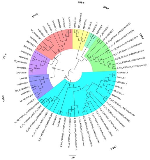 We sought to further understand how these TPS sequences relate to a larger family comprised of both angiosperm and gymnosperm TPS sequences. Based on the filtered TPS protein-coding sequences of P. chienii and other TPS sequences from gymnosperms and angiosperms, the TPS phylogenetic tree showed that the sequences clearly fell into seven clades (from the TPS-a clade to the TPS-g clade). All TPS sequences from P. chienii were clustered in the TPS-d clade and TPS-e clade, which was consistent with the results of Cupressus gigantea [31]. The TPS-d clade possessed 17 TPS sequences from P. chienii and eight TPS sequences from other gymnosperms. The 17 TPS sequences of P. chienii contained in the TPS-d clade were also identified as belonging to the TPS-d subfamily based on the annotated results. Seven TPS sequences from P. chienii with no subfamily identification and two TPS sequences from Solanum lycopersicum were clustered in the TPS-e clade (Figure 7).