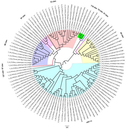 The CYP450 phylogenetic tree with high bootstrap support >80% at most nodes showed that 112 putative CYP450 unigenes were classified into nine clans and 30 families and were divided into two categories: type A (71 clan) and non-type A (all other clans) (Figure 8). Within the NJ tree, 47.32% (53 unigenes) of the 112 putative CYP450 unigenes were type A and belonged to 11 families (CYP719, CYP701, CYP76, CYP75, CYP73, CYP78, CYP703, CYP93, CYP736, CYP92, and CYP82). The remaining 52.68% (59 unigenes) putative CYP450 unigenes were non-type A and were distributed among eight clans (727 clan, 97 clan, 86 clan, 72 clan, 710 clan, 74 clan, 51 clan, and 85 clan) and 18 families (CYP727, CYP97, CYP94, CYP86, CYP704, CYP734, CYP735, CYP714, CYP749, CYP710, CYP74, CYP51, CYP720, CYP90, CYP729, CYP716, CYP728, and CYP718), which included a more diverse group of unigenes. Type A CYP450s (71 clan) were identified to be related to the biosynthesis of secondary compounds. The non-type A CYP450s were involved in the metabolic pathways of primary products, plant hormones, and secondary products [33]. As a result, a large number of secondary metabolites were synthesized, and functioned as plant growth signals or protected plants from stresses [32].