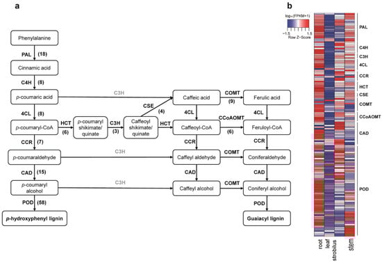 Based on the KEGG database, a total of 489 unigenes involved in the phenylpropanoid biosynthesis pathway were identified in four organs of P. chienii (Table S19, Figure 9a). For the phenylpropanoid biosynthetic pathway, 11 known enzymes were detected among the four organs, including PAL (phenylalanine ammonia-lyase, 100 unigenes), CYP73A/C4H (trans-cinnamate 4-monooxygenase, 16 unigenes), 4CL (4-coumarate CoA ligase, 51 unigenes), CCR (cinnamoyl-CoA reductase, 18 unigenes), HCT (shikimate O-hydroxycinnamoyltransferase, 27 unigenes), CYP98A/C3H (5-O-(4-coumaroyl)-d-quinate 3′-monooxygenase, 22 unigenes), CAD (cinnamyl-alcohol dehydrogenase, 58 unigenes), POD (peroxidase, 120 unigenes), CSE (caffeoyl shikimate esterase, 6 unigenes), COMT (caffeic acid 3-O-methyltransferase, 20 unigenes), and CCoAOMT (caffeoyl-CoA O-methyltransferase, 51 unigenes). Among them, 18 unigenes of PAL, eight of C4H, eight of 4CL, three of C3H, seven of CCR, six of HCT, six of CCOAOMT, four of CSE, nine of COMT, 58 of POD, and 15 of CAD were DEGs (Table S20). The expression patterns of these 142 DEGs associated with the phenylpropanoid biosynthesis pathway in four organs are shown in Figure 9b. Of these 142 DEGs, 82 DEGs were predominantly expressed in the root, including nine of PAL, five of C4H, two of C3H, six of 4CL, two of CCR, six of HCT, four of CSE, six of COMT, four of CCoAOMT, six of CAD, and 32 of POD. However, most of the DEGs (138 DEGs, accounting for 97.18%) had lower expression levels in the leaf than in the other three organs. In our study, we identified the complete pathway that forms the guaiacyl and p-hydroxyphenyl units, which are composed lignins of gymnosperms (Figure 9a).
