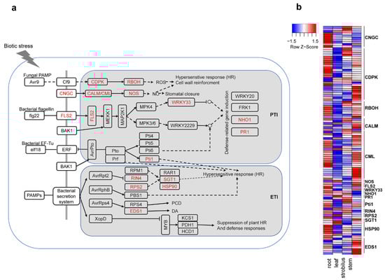 Plant–pathogen interactions in P. chienii and the differentially expressed genes (DEGs) involved in the plant–pathogen interactions in four organs of P. chienii. (a) A simplified diagram of the plant–pathogen interactions; (b) a heatmap of the DEGs involved in the plant–pathogen interactions in four organs. CNGCs: cyclic nucleotide-gated channel; FLS2: LRR receptor-like serine/threonine protein kinase FLS2; BAK1: brassinosteroid insensitive 1-associated receptor kinase; CDPK: calcium-dependent protein kinase; RBOH: respiratory burst oxidase; CALM: calmodulin; CML: calcium-binding protein CML; NOS: nitric-oxide synthase; PR1: pathogenesis-related protein; NHO1: glycerol kinase; RIN4: RPM1-interacting protein; RPS2: disease resistance protein RPS2; SGT1: suppressor of G2 allele of SKP1; EDS1: enhanced disease susceptibility 1 protein; HSP90: heat shock protein 90.