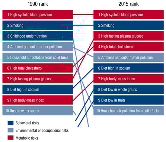 Global risk factors for global deaths in 1990 compared with 2015 outlined in the Global Burden of Disease Study (GDB). Reused from Münzel et al. [10] with permission. Copyright © 2020, Oxford University Press.