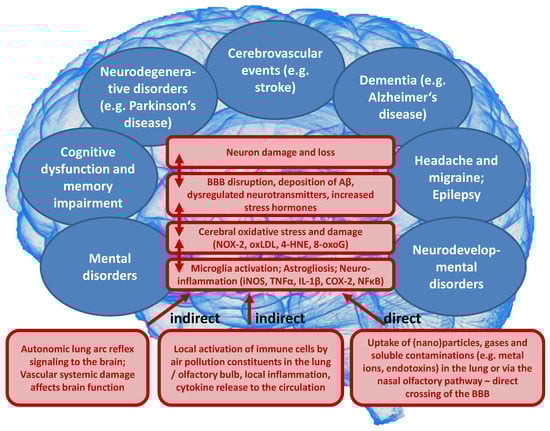 Proposed concept how air pollution constituents contribute to neurological and mental disorders. Uptake of fine particulate matter, reactive gases or secondary environmental toxins (bound to the solid or liquid aerosol particles) such as heavy metals, endotoxins or photoreaction/atmospheric chemistry products (e.g., reactive aldehydes, nitrated VOCs) by three major pathways (indirect or direct). Neuroinflammation and cerebral oxidative stress by microglia activation impairs vital pathways in the brain initiating pathophysiological processes such as amyloid deposition and neuron damage and loss. BBB, blood-brain barrier; iNOS, inducible nitric oxide synthase; TNFα, tumor necrosis factor alpha; IL-1β, interleukin 1beta; COX-2, (inducible) cyclooxygenase 2; NFκB, nuclear factor ‘kappa-light- chain-enhancer’ of activated B-cells; NOX-2, NADPH oxidase isoform 2 (phagocytic NADPH oxidase); oxLDL, oxidized low density lipoprotein; 4-HNE, 4-hydroxynonenal; 8-oxoG, 8-hydroxyguanosine; Aβ, amyloid beta peptide.