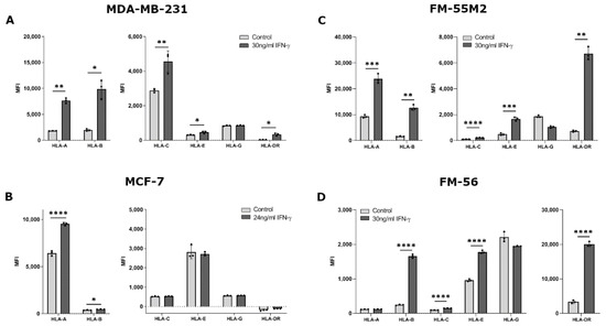 HLA surface expression on cancer cell lines stimulated with interferon (IFN)-γ. Flow cytometry analysis of HLA-A, HLA-B, HLA-C, HLA-G, HLA-E, and HLA-DR expression. (A) MDA-MB-231 cells treated with 30 ng/mL IFN-γ for two days. (B) MCF-7 cells treated with 24 ng/mL IFN-γ for two days. (C) FM-55M2 cells treated with 30 ng/mL IFN-γ for two days. (D) FM-56 cells treated with 30 ng/mL IFN-γ for two days. Shown are median fluorescence intensity (MFI) with mean ± SD, each dot represents one sample. All cell lines are HLA-G-negative and the shown MFI level of control samples represent the background. * p < 0.05, ** p < 0.01, *** p < 0.001, **** p < 0.0001 (Student’s unpaired t-test with Welch’s correction).