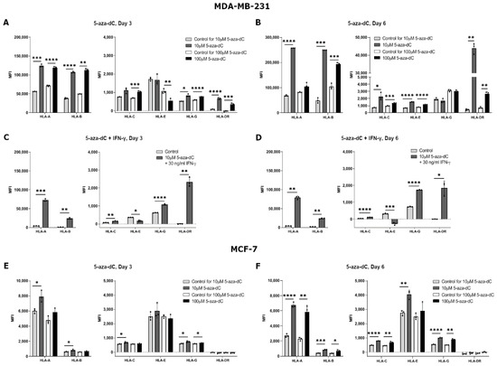 HLA surface expression on breast cancer cell lines stimulated with 5-aza-2′-deoxycytidine (5-aza-dC). Flow cytometry analysis of HLA-A, HLA-B, HLA-C, HLA-G, HLA-E, and HLA-DR expression. (A,B) MDA-MB-231 cells treated with either 10 µM or 100 µM 5-aza-dC for three (A) and six days (B). (C,D) MDA-MB-231 cells treated with 10 µM 5-aza-dC and 30 ng/mL IFN-γ for three (C) and six days (D). (E,F) MCF-7 cells treated with either 10 µM or 100 µM 5-aza-dC for three (E) and six days (F). Shown are median fluorescence intensity (MFI) with mean ± SD, each dot represents one sample. The shown MFI level of control samples represent a combination of background and baseline expression. * p < 0.05, ** p < 0.01, *** p < 0.001, **** p < 0.0001 (Student’s unpaired t-test with Welch’s correction).