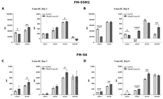 As we mostly observed the biggest change in HLA expression upon stimulation with 100 µM compared to 10 µM 5-aza-dC in the breast cancer cell lines, stimulation of the malignant melanoma cell lines was performed with only 100 µM. Treatment of FM-55M2 with 100 µM 5-aza-dC for three days promoted a significant upregulation of HLA-B and HLA-G expression, whereas there was a decrease in HLA-A expression and no change in HLA-C, HLA-E, and HLA-DR expression (HLA-A, p = 0.0476; HLA-B, p = 0.0046; HLA-G, p = 0.0180) (Figure 4A). After six days of treatment, FM-55M2 cells had a lower expression of HLA-A and HLA-C, a higher expression of HLA-E and HLA-DR, and no change in HLA-B and HLA-G expression (HLA-A, p < 0.0001; HLA-C, p = 0.0131; HLA-E, p < 0.0001; HLA-DR, p = 0.0014) (Figure 4B). For FM-56 cells, treatment with 5-aza-dC for three days led to a significant increase in surface expression of HLA-B and HLA-G and a tendency towards higher expression of most of the other HLA molecules (HLA-B, p = 0.0383; HLA-G, p = 0.0166) (Figure 4C). However, the cells displayed a significantly higher expression of all HLA molecules after six days of treatment except for HLA-DR (HLA-A, p = 0.0009; HLA-B, p = 0.0011; HLA-C, p = 0.0392; HLA-E, p < 0.0001; HLA-G, p = 0.0039) (Figure 4D).