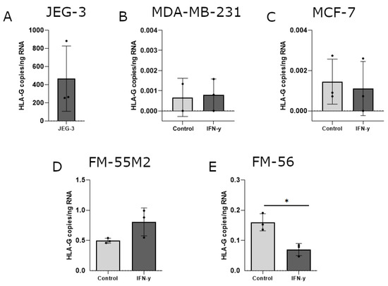 HLA-G mRNA expression in cancer cell lines stimulated with interferon (IFN)-γ. The effect of IFN-γ on the transcriptional level of HLA-G was determined by digital droplet (dd)PCR and presented as number of HLA-G copies per amount of RNA. (A) JEG-3 control cells with high HLA-G expression. (B) MDA-MB-231 cells treated with 30 ng/mL IFN-γ for two days. (C) MCF-7 cells treated with 24 ng/mL IFN-γ for two days. (D) FM-55M2 cells treated with 30 ng/mL IFN-γ for two days. (E) FM-56 cells treated with 30 ng/mL IFN-γ for two days. Shown are mean ± SD, each dot represents one sample. * p < 0.05 (Student’s unpaired t-test with Welch’s correction).