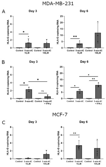 HLA-G mRNA expression in stimulated breast cancer cell lines. The effect of 5-aza-dC on the transcriptional level of HLA-G was determined by ddPCR and presented as number of HLA-G copies per amount of RNA. (A) MDA-MB-231 cells treated with 10 μM or 100 μM 5-aza-dC for three and six days. (B) MDA-MB-231 cells treated with a combination of 10 μM 5-aza-dC and 30 ng/mL IFN-γ for three and six days. (C) MCF-7 cells treated with 10 μM or 100 μM 5-aza-dC for three and six days. Shown are mean ± SD, each dot represents one sample. * p < 0.05, ** p < 0.01 (Student’s unpaired t-test with Welch’s correction).