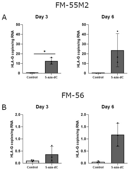HLA-G mRNA expression in stimulated malignant melanoma cell lines. The effect of 5-aza-dC on the transcriptional level of HLA-G was determined by ddPCR and presented as number of HLA-G copies per amount of RNA. (A) FM-55M2 cells treated with 100 μM 5-aza-dC for three and six days. (B) FM-56 cells treated with 100 μM 5-aza-dC for three and six days. Shown are mean ± SD, each dot represents one sample. * p < 0.05 (Student’s unpaired t-test with Welch’s correction).