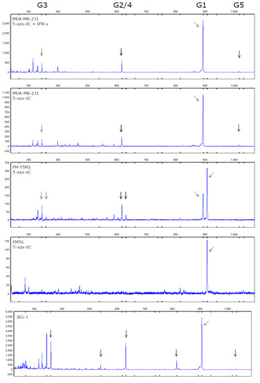 As described previously, there are seven verified HLA-G isoforms. The different isoforms might constitute different functional forms of HLA-G, also emphasized by a marked heterogeneity in isoform expression observed within the same tumor for some cancers [22]. To further investigate the expression of HLA-G upon 5-aza-dC treatment, we assessed the HLA-G mRNA isoform profile. We performed fragment analysis by capillary electrophoresis of reverse transcriptase PCR products from MDA-MB-231, MCF-7, FM-56, and FM-55M2 cells treated with 5-aza-dC. For the malignant melanoma cell lines, we also performed the analysis on unstimulated control cells, since ddPCR showed low levels of HLA-G mRNA before treatment.