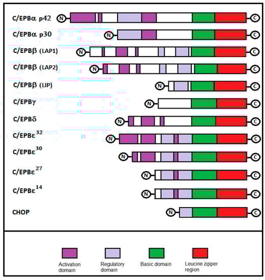 The C/EBP family consists of six structurally and functionally homologous transcription factors—C/EBPα, C/EBPβ, C/EBPδ, C/EBPγ, C/EBPε, and CHOP (Figure 1). Similarities between C/EBP family members suggest an evolutionary history of genetic duplications with a subsequent pressure to diversify them. Each member of this family varies in tissue specificity and transactivating activity. The genes encoding C/EBPβ, C/EBPδ, C/EBPε, and CHOP have been mapped on chromosome 20, 8, 14, and 12 respectively. C/EBPα and C/EBPγ are both located on chromosome 19. However, despite the existence of six genes, the number of C/EBP proteins can be considerably higher. This depends on the production of different sized C/EBP proteins, due to the alternative use of translation initiation codons in the same mRNA molecule, and the alternative use of promoters or differential splicing [6,7,8]. Moreover, for some members, the expression of the protein does not correlate with that for mRNA, indicating tissue-specific post-transcriptional regulatory mechanisms. Apart from C/EBPγ and CHOP that are expressed ubiquitously, the other isoforms of C/EBP are distributed in specific tissues. For example, C/EBPα is prevalently expressed in the adipose tissue, blood mononuclear cells, liver, intestine, lung, adrenal gland, blood, nervous system, and placenta; C/EBPβ is expressed in the liver, adipose tissue, myelomonocytic cells, intestine, lung, spleen, nervous system, and kidney; C/EBPδ in the adipose tissue, myeloid cells, lung, nervous system, and intestine; and C/EBPε is expressed in myeloid and lymphoid cells (Table 1). The importance of the C/EBP family in adipose tissues was confirmed by numerous studies that have shown the role of C/EBPα, β, and γ in adipocyte differentiation [9,10,11,12]. Four members of the C/EBP family (α, β, δ, and ε) are expressed in myeloid cells where they play a crucial role in myeloid-cell differentiation [13,14,15]. C/EBPα and C/EBPβ are widely expressed in hepatocytes, where they are involved in the regulation of terminal hepatocyte differentiation and in the maintenance of normal function and responses to injury [16]. CEBPβ is required for mammary-gland development, for the functional differentiation of mammary epithelial cells and the expression of milk protein genes [17]. Finally, CEBPs are implicated in the differentiation of keratinocytes (C/EBPβ), neuronal cells (C/EBPβ), and intestinal epithelial cells (C/EBPα) [18,19,20].