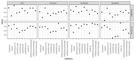 The benchmark analysis involved AmpGram and other top-ranking AMP predictors: AMPScanner [24], ADAM [25], iAMP-2L [26], CAMPR3 [27] and iAMPpred [28]. In order to compare their performance, the values of AUC (the Area Under the ROC receiver operating characteristic—Curve), precision, sensitivity and specificity were calculated for the test dataset. The performance results include the division of the benchmark dataset into five groups according to the sequence length (for details, see Section 3). However, to keep the article concise only the results for (i) all lengths and (ii) the longest AMPs are presented. The group of all lengths is dominated by shorter sequences, from ten to 60 amino acids, i.e., typical AMPs, and therefore biased against longer peptides and proteins. Consequently, the results in Figure 1 and Table 2 and Table 3 include the most informative groups analyzed. The complete results of the research are available in the Supplementary Materials (Figure S2 and Tables S1–S4).