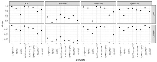 Comparison of AmpGram and AMPscanner [24] performance on the DAMPD dataset with other predictors from Gabere and Noble’s benchmark and according to their methodology [29]. Sequences used to train either AmpGram or AMPScanner were removed from the dataset. The benchmark without their removal is presented in Table S5 in the Supplementary Materials. The very low values of precision are due to the very large negative dataset used (for details, see Section 3).