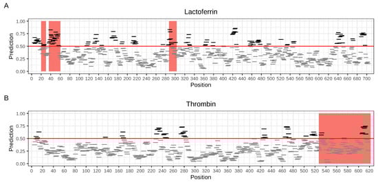 As indicated in the benchmark section, AmpGram is the best AMP classifier that also robustly detects longer AMPs. Moreover, AmpGram predicts regions that have some antimicrobial potential. It scans a protein sequence with a sliding window of 10 amino acids in search of n-grams characteristic for AMPs and non-AMPs. Consequently, it divides the protein into overlapping subsequences of 10 amino acids (10-mers) that either are or are not AMPs (for details, see Section 3). The 10-mers are subsequently plotted along the sequence of the whole protein indicating regions that have strong antimicrobial potential. In Figure 3, exemplary results for lactoferrin (AmpGram prediction probability 0.627) and thrombin (AmpGram prediction probability 0.839) are presented.