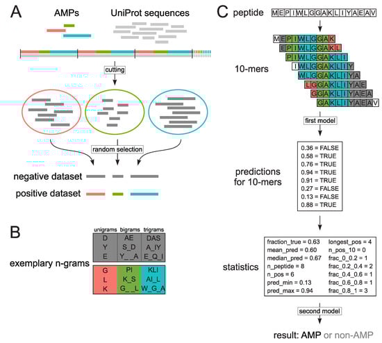 Schematic representation of datasets preparation (A), n-grams (B) and decision-making procedure in AmpGram (C). The positive dataset was constructed from sequences downloaded from the dbAMP database [39] (red, green and blue horizontal lines). To create the negative dataset, non-antimicrobial sequences (grey horizontal lines) were retrieved from the UniProt database [38]. The sequences were first concatenated into one string (grey horizontal line), and then cut (black vertical lines) into blocks corresponding in length to sequences from the positive dataset (red, green and blue horizontal line). The extracted blocks were next cut (not indicated in the figure) into subsets corresponding in length to sequences from the positive dataset (red, green and blue circles) and from them individual sequences were randomly selected for the negative dataset (A). Exemplary n-grams used to train AmpGram: the positive n-grams are shaded in red, green and blue, and the negative ones in grey (B). To make a prediction, AmpGram first divides a peptide into subsequences of 10 amino acids (10-mers). For each 10-mer, AmpGram makes a prediction if it is an AMP (true) or not (false) (first model). To scale the prediction for 10-mers to the whole peptide, a lot of statistics is calculated and on their basis AmpGram makes the final prediction (second model). Abbreviations of the statistics: Fraction_true--fraction of positive 10-mers, pred_mean–mean value of prediction, pred_median–median of prediction, n_peptide - number of 10-mers in a peptide, n_pos–number of positive 10-mers, pred_min–minimum value of prediction, pred_max–maximum value of prediction, longest_pos–the longest stretch of consecutively occurring 10-mers predicted as positive, n_pos_10–number of streches comprising of at least 10 10-mers predicted as positive, frac_0_0.2--fraction of 10-mers with prediction in range [0, 0.2], frac_0.2_0.4–fraction of 10-mers with prediction in range (0.2, 0.4], frac_0.4_0.6–fraction of 10-mers with prediction in range (0.4, 0.6], frac_0.6_0.8–fraction of 10-mers with prediction in range (0.6, 0.8], frac_0.8_1–fraction of 10-mers with prediction in range (0.8, 1]) (C).
