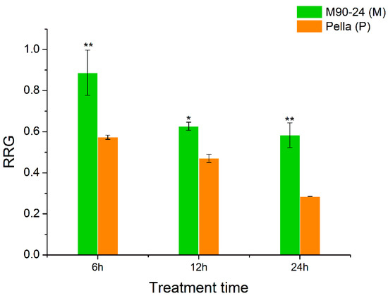 In Equation (1), root growth (RG) is the difference between the average root length after 6, 12, or 24 h of treatment (RLt) and the average root length before (0 h) treatment (RL0). In Equation (2), RRG is the ratio of RG under Al treatment and control.