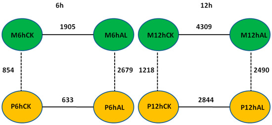 Diagram of the differentially expressed genes (DEGs) identified from different comparisons between samples from the two soybean varieties under Al stress (25 μM AlCl3, pH = 4.3) and control (0 μM AlCl3, pH = 4.3) at 6 and 12 h.