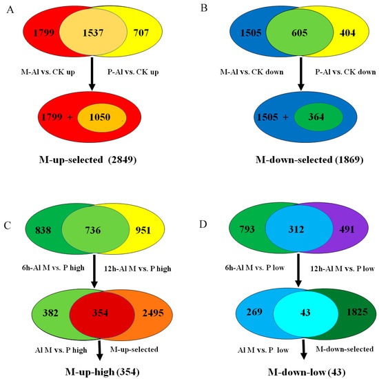 In detail, 3336 and 2244 genes were up-regulated by Al stress in M and P, respectively, among which 1799 Al-up-regulated genes were specific to M and 1537 Al-up-regulated genes overlapped between M and P (Figure 3A). Among the 1537 overlapped Al-up-regulated genes, 1050 genes were up-regulated more in M than P. Together, 2849 Al-up-regulated genes, including 1799 specific to M and 1050 genes overlapped between M and P but with more fold change in M than P, were designated as M-up-selected (Figure 3A, Table S6). Similarly, 1869 Al-down-regulated genes, including 1505 specific to M and 364 overlapped between M and P genes with more down-regulation in M than P, were designated as M-down-selected (Figure 3B, Table S7).