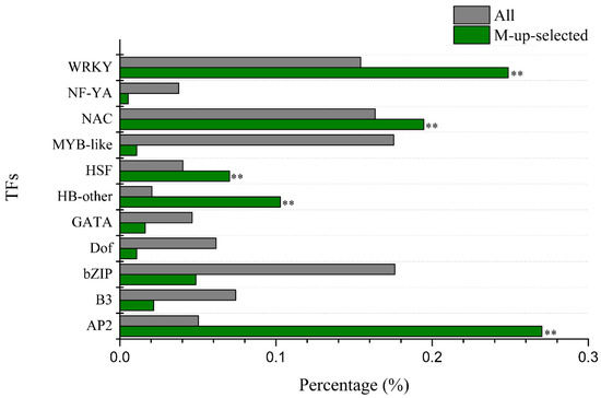 Enrichment of the transcription factor (TF) families among the M-up-selected genes. The percentage of TF families in M-up-selected genes and all TFs in soybean genome was shown as green bars and grey bars, respectively. ** indicate significant enrichment at 0.01 level.
