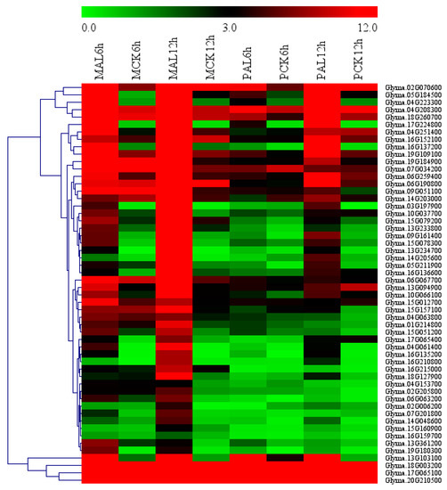 By using the criteria of false discovery rate (FDR) < 0.05 and |log2 (fold change)| > 1, the differentially expressed genes (DEGs) between Al stress and control at 6 and 12 h in the roots of two soybean varieties were identified, respectively. There were 1905 and 4309 DEGs between Al stress and control at 6 and 12 h in M, respectively, while there were 633 and 2844 DEGs between Al stress and control at 6 and 12 h in P, respectively (Figure 2). In the Al-tolerant soybean variety M, there were 633 up-regulated and 1272 down-regulated DEGs between Al stress and control at 6 h, respectively, while there were 3176 up-regulated and 1133 down-regulated DEGs between Al stress and control at 12 h, respectively (Table S3). In the Al-sensitive soybean variety P, there were only 169 up-regulated and 464 down-regulated DEGs between Al stress and control at 6 h, respectively, and 2189 up-regulated and 655 down-regulated DEGs between Al stress and control at 12 h, respectively (Table S3). Fifteen and 21 pathways were enriched in up- or down-regulated genes in M, respectively, while 14 and 16 pathways were enriched in up- or down-regulated genes in P, respectively (Table S4). Arginine and proline metabolism (ko00330) as well as photosynthesis (ko00195) were only enriched in the up-regulated genes in the Al tolerant soybean variety M (Table S4). Circadian rhythm-plant (ko04712), flavonoid biosynthesis (ko00941), nitrogen metabolism (ko00910), phenylalanine metabolism (ko00360), plant-pathogen interaction (ko04626), and sulfur metabolism (ko00920) were enriched only in up-regulated genes in both soybean varieties. Six pathways including amino sugar and nucleotide sugar metabolism (ko00520), diterpenoid biosynthesis (ko00904), DNA replication (ko03030), mismatch repair (ko03430), pentose and glucuronate interconversions (ko00040), as well as valine, leucine and isoleucine degradation (ko00280), were enriched only in down-regulated genes in both soybean varieties. Phenylalanine biosynthesis (ko00940) was enriched in both up- and down- regulated genes in both soybean varieties (Table S4).