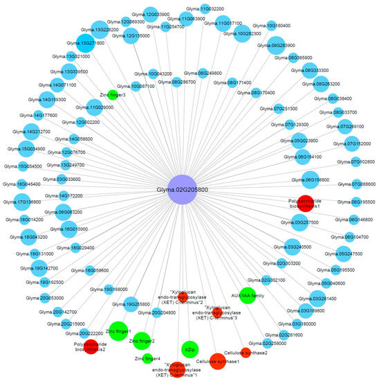The co-expression network of the genes in the M-up-selected list (Table S6) was analyzed and a total of six modules were identified (Figure S5). Among these modules, the green module (containing 267 genes) showed a significant (p = 7 × 10−5) positive correlation (r = 0.97) with RRG. To screen the key genes from the green module, we further identified the hub genes via co-expression network in green module. One hub gene, Glyma.02G205800, has the highest module membership value, which encodes a cellulose synthase. We then constructed the visual co-expression network of this hub gene (Figure 6) and found that its co-expressed genes include genes encoding AUX/IAA transcription factor (Glyma.20G210500), bZip transcription factor (Glyma.05G182500), cell wall related proteins such as cellulose synthases (Glyma.04G063800 and Glyma.04G153700), XET (Glyma.17G064900, Glyma.18G003200 and Glyma.19G184900), polysaccharide biosynthesis-related proteins (Glyma.16G001600 and Glyma.17G169200), zinc finger proteins (Glyma.06G076600, Glyma.14G177900, Glyma.15G072700 and Glyma.18G074600), and others. Zinc finger proteins, bZip transcription factors, cell wall-related proteins and AUX/IAA transcription factors have been shown to be associated with Al tolerance [47,48,49,50], which indicates that the hub gene Glyma.02G205800, together with its co-expressed genes, might play important roles in soybean tolerance to Al toxicity.