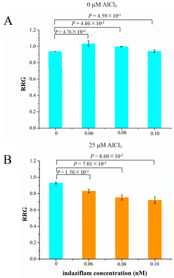 After germination, three-day-old seedlings were transferred to 500 mL plastic beakers filled with 0.5 mM CaCl2 solution (pH 4.3) for 24 h. Then these seedlings were transferred to 0.5 mM CaCl2 solution (pH 4.3) solutions containing 0 or 25 µM AlCl3 with different concentrations of indaziflam (0, 0.06, 0.08 and 0.10 nM, respectively). The root length was measured and RRG was calculated as described above, except that the RRG is the ratio of RG under indaziflam (0.06, 0.08 and 0.10 nM) treatment and control (0 nM indaziflam).