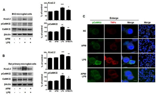 APM has long been known as a specifically selective blocker of SK2 channels [27]. Ca2+/calmodulin-dependent protein kinase II (CaMKII), one of the main downstream targets of Ca2+ and CaM, is activated by Ca2+/CaM [29]. TNFα is produced in SK2/KCa2.2 channel-activated microglia [8]. To examine whether APM itself can regulate the SK2/KCa2.2 channel, BV2 and rat primary microglial cells were treated with APM for 1 h followed by LPS for 6 h, and immunoblotting was conducted with anti-KCa2.2 and CaMKII antibody. The expression of LPS-induced KCa2.2 and pCaMKII significantly increased compared with normal control, respectively (p < 0.001, p < 0.01). APM itself significantly inhibited LPS-induced KCa2.2 (p < 0.05) and pCaMKII (p < 0.01) expression in BV2 microglial cells (Figure 2A). These results are consistent with LPS-induced rat primary microglial cells (Figure 2B). To further confirm our findings, we observed the subcellular localization of pCaMKII and TNFα expression (Figure 2C). As expected, APM significantly decreased LPS-induced subcellular localization of pCaMKII and TNFα expression in BV2 microglial cells. Our results suggest that APM itself directly inhibits LPS-induced SK2/KCa2.2 expression. Thus, a decrease in the subcellular localization of pCaMKII and TNFα expression observed.