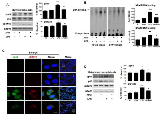 APM suppresses translocation of p65 and STAT3 in LPS-stimulated BV2 and rat primary microglial cells. Cells were treated with APM for 1 h followed by LPS for 6 h. Expression of pp65 and pSTAT3 in nuclear extracts was measured by immunoblotting in BV2 and rat primary microglial cells. APM significantly reduced LPS-induced phosphorylation of p65 and pSTAT3 in BV2 (A) and rat primary microglial cells (D). DNA-binding activity of NF-κB and STAT3 in nuclear extracts was measured by electrophoretic mobility shift analysis (EMSA) in BV2 microglial cells (B). EMSA was quantified by densitometric analysis. Immunofluorescence double staining for pp65 (green) and pSTAT3 (red) localization (C) in BV2 microglial cells. Cell were counterstained with DAPI (blue). Magnification 400×. Enlarge figure of scale bars: 5 μm. βActin was used to confirm equal sample loading. pp65 and pSTAT3 followed by densitometric analysis. The data are representative of three independent experiments and quantified as mean values ± SEM. Tukey’s multiple comparison test, * p < 0.05, ** p < 0.01, *** p < 0.001 compared to normal control.