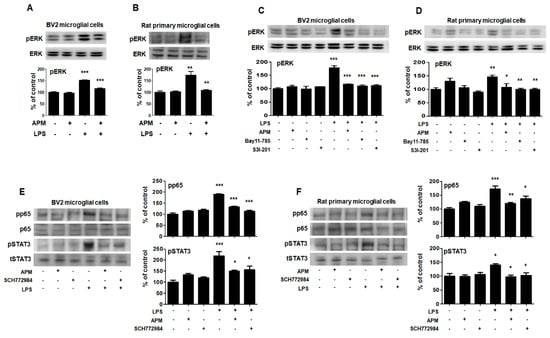 To further investigate the interaction role of in LPS-induced phosphorylation of p65/STAT3 and MAPK-ERK, cells were treated with Bay11-7085, S3I-201, SCH772984, and APM. LPS-induced phosphorylation of MAPK-ERK was significantly inhibited by Bay11-7085, S3I-201, and APM in BV2 microglial cells (Figure 5C). These results were alco consistent with those of LPS-stimulated rat primary microglial cells (Figure 5D). In addition, LPS-induced phosphorylation of p65/STAT3 was significantly inhibited by SCH772984 and APM in BV2 microglial cells (Figure 5E). These results were alco consistent with those of LPS-stimulated rat primary microglial cells (Figure 5F). Together, these data confirm the interaction between MAPK-ERK phosphorylation and p65/STAT3 translocation in activated microglia, suggesting that APM plays an important role as their modulator.