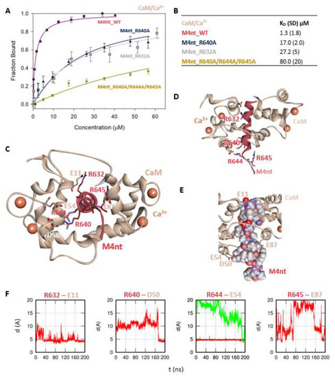 More specifically, the protein–protein docking of M4nt_WT into the 1–17 (2BCX) structure of CaM provided two complexes that corresponded to the canonical hydrophobic binding motifs 1–14/1–17 and 1–10. The R632, R644 and R645 of M4nt_WT were involved in the salt bridges formed with E11, D50, E54 and E87 of CaM (according to conventional numbering). During the MD simulations, all the studied basic amino acids of M4nt_WT (i.e., R632, R640, R644 and R645) were significantly involved in the salt bridges with the acidic residues E11, D50, E54 and E87 of CaM (Figure 2C–F, Figure S1).