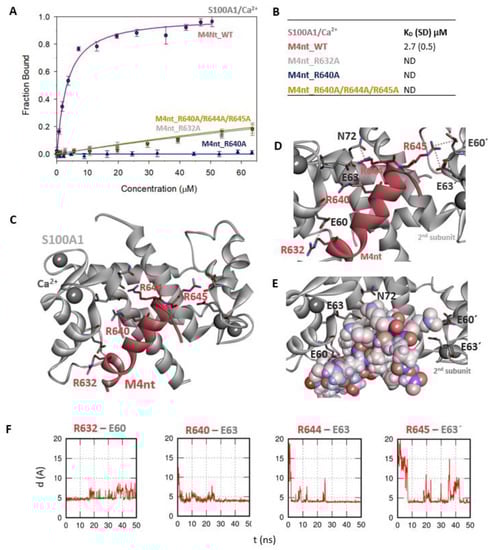 The M4nt/S100A1 complex. (A) The FB of fluorescently labelled M4nt_WT (circles), M4nt_R632A (squares), M4nt_R640A (up-triangles) and M4nt_R640A/R644A/R645 (down-triangles) as a function of S100A1 (grey) concentrations. M4nt peptides were titrated by S100A1, and FB was calculated according to Equation 1; the solid lines represent the best fit to the binding isotherm from Equation 2 (Methods). (B) The equilibrium KD of the M4nt-binding epitope in complexes with S100A1 obtained by steady-state FA. (C) M4nt/S100A1 in the context of the whole S100A1 in the presence of Ca2+ as a result of MDs. The side chains of M4nt (ribbon representation, deep-pink colour), with displayed R632, R640, R644 and R645 basic residues involved in the interaction with S100A1 (ribbon representation, grey colour). (D) The M4nt/S100A1 complex in detailed view; the binding partners are shown in the same representation as in Figure 3C, with salt bridges in atomic detail displayed as sticks: R632-E60, R640-E63, R644-E63, N72 and R645-E60´ and E63´ of the 2nd monomer. (E) The M4nt/S100A1 complex in detailed view; M4nt is shown in CPK (partial charge colouring) representation, S100A1 displayed with E60, E63 and N72 of the 1st monomer and E60´ and E63´ of the 2nd S100A1 monomer with negatively charged residues (stick representation, grey colour) involved in the interactions with M4nt. Ca2+ displayed in a ball representation, grey colour. (F) Time-dependent geometry characteristics of the studied salt bridges R632-E60, R640-E63, R644-E63 and R645-E63´ from the MD simulations. A stable salt bridge is expected to have a distance of about 5 Å between the termini of oppositely charged amino acids. ND: not determined.