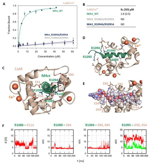 The protein–protein docking of M4ct_WT into the 1–14 (1CDL) structure of CaM resulted in a complex with the hydrophobic-binding motif 1–7/1–10. A similar complex was obtained by the docking of M4ct_WT into the 1–17 (2BCX) structure of CaM. However, only R1090 and R1094 of M4ct_WT formed salt bridges with their acidic counterparts of CaM. Nevertheless, within subsequent MD simulations, all the studied basic amino acids (i.e., R1086, R1090, R1094 and R1095) successfully found their acidic counterparts D50, E54, E80, E84 and E114 in CaM (Figure 4C–F, Figure S2).