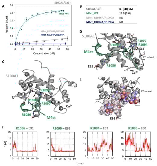 The M4ct/S100A1 complex. (A) The FB of fluorescently labelled M4ct_WT (circles), M4ct_R1086A/R1090A (squares) and M4ct_R1094A/R1095A (up-triangles) as a function of S100A1 (grey) concentrations. M4ct peptides were titrated by S100A1, and FB was calculated according to Equation (1); the solid lines represent the best fit to the binding isotherm from Equation (2) (Methods). (B) The equilibrium KD of the M4ct-binding epitope in complexes with S100A1 obtained by steady-state FA. (C) M4ct/ S100A1 in the context of the whole S100A1 in the presence of Ca2+ as a result of MDs. The side chains of M4ct (ribbon representation, green colour) with displayed R1086, R1090, R1094 and R1095 basic residues involved in the interaction with S100A1 (ribbon representation, grey colour). (D) The M4ct/S100A1 complex in detailed view; the binding partners are shown in the same representation as in Figure 5C, with salt bridges in atomic detail displayed as sticks: R1086-E91, R1090-E63, R1094-E63 and R1095-E60 and R1090- and R1094-E63´ of the 2nd monomer. (E) The M4ct/S100A1 complex in detailed view; M4ct is shown in CPK (partial charge colouring) representation, S100A1 displayed with E60, E63 and N72 of the 1st monomer and E63´ of the 2nd S100A1 monomer, with negatively charged residues (sticks representation, grey colour) involved in the interactions with M4ct. Ca2+ displayed in a ball representation, grey colour. (F) Time-dependent geometry characteristics of the studied salt bridges R1086-E91, R1090-E63, R1094-E63 and R1095-E60 from MD simulations. A stable salt bridge is expected to have a distance of about 5Å between the termini of oppositely charged amino acids.