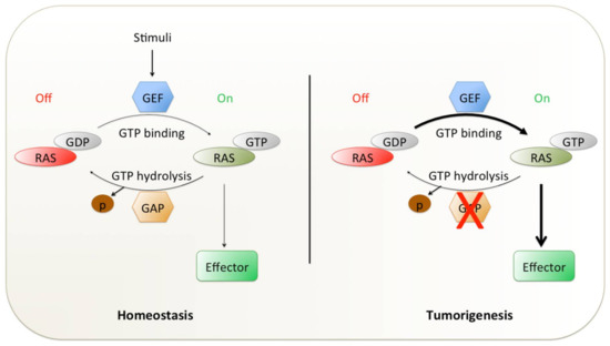 The two states of RAS family GTPases. GTP- and GDP-bound states are directed by GEFs and GAPs. GEFs stimulate the exchange of GDP to GTP, promoting activation of RAS (On). GAPs drive GTP hydrolysis and return to inactive GDP-bound status (Off). The thickness of the arrows indicates the strength of GTP binding as well as the (hyper)activation of downstream effectors. The red cross indicates the impairment of GTP hydrolysis. GEF: guanine nucleotide exchange factor; GAP: GTPase-activating protein; GTP: guanosine triphosphate; GDP: guanosine diphosphate; RAS: rat sarcoma proto-oncogene