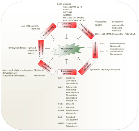 Many of the downstream effectors of the KRAS pathway (e.g., RAF, MEK, PI3K and mTOR) are rational therapeutic targets and their potential value has been evaluated in many NSCLC clinical trials. Different KRAS codon subtypes show a preference for activating different downstream signaling [27]; hyperactivation of the MAPK pathway is a key feature in KRAS-driven lung cancer. One explanation for this is that the most common subtype G12C exhibits more prominent engagement with MAPK signaling [71]. Several clinical trials are underway evaluating the potential of the inhibition of KRAS functional output by single agents or in combinatorial schedules with chemotherapy, other targeted agents and/or radiation therapy (e.g., NCT03415126, NCT01859026, NCT02964689, NCT03704688, NCT01306045, NCT01912625, NCT02185690, NCT04121286, NCT03990077, NCT02450656, NCT03989115, NCT04045496).