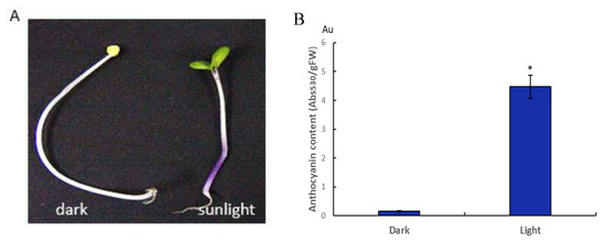 The phenotype of Brassica rapa subsp. rapa cv. Tsuda seedling and anthocyanin content after dark and sunlight treatment. (A) Seedlings were exposed to sunlight or darkness. (B) Anthocyanin was extracted from fresh whole seedlings, and the concentration was determined using absorbance at 530 nm per gram of fresh mass. Vertical bars indicate ± SE of replicate assays (n = 8). The statistically significant difference between light treatment and dark is shown (t-test, * p < 0.05).
