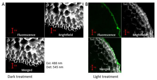 When the seedlings of Brassica rapa were exposed to sunlight, pigments could accumulate in the hypocotyls of seedlings and showed a light-induced photomorphogenic phenotype with de-etiolation, phototropism, cotyledon expansion, chlorophyll synthesis, and short hypocotyls. Also, the content of anthocyanin in light-induced seedlings is much higher than that in dark treated seedlings (Figure 1). To clarify the distribution of anthocyanin in epidermal cells of hypocotyls, a hypocotyl cross-section was cut and examined using a confocal microscope. The result showed that anthocyanins synthesize in the outermost layer cells of the light treated hypocotyls and no anthocyanins accumulate in outer epidermal cells of dark treated hypocotyls (Figure 2).