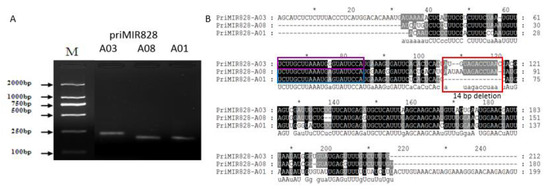 Three candidate primary miR828 transcripts were identified by qRT-PCR and sequences alignment showed they are respectively located in B. rapa chromosome A03, A08, and A01. (A) Electrophoresis of PCR product on agarose gel. (B) The sequences of these primary miR828 transcripts are highly similar except that primiR828-A01 has a 14 bp sequence deletion. The sequences in blue box and purple box respectively represent the region of miR828a and miR828b.