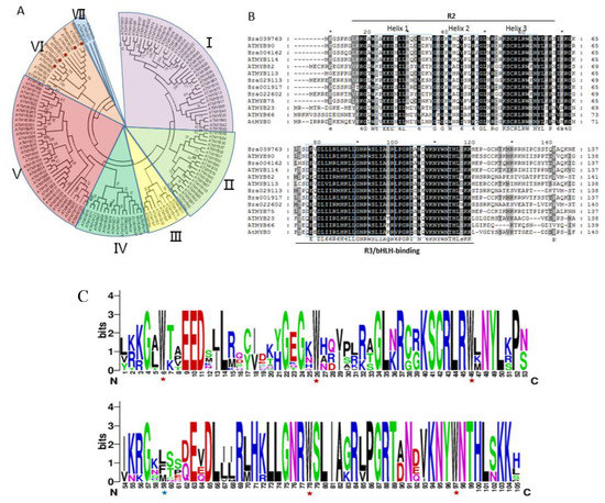 Phylogenetic analysis of candidate BrMYBs and multiple sequence alignment of R2R3 MYB family in Brassica rapa and AtMYBs in Arabidopsis. (A) The phylogenetic tree was constructed by using the Neighbor-Joining method [58] with 1000 bootstrap replicates [59]. Branches corresponding to partitions reproduced in less than 40% bootstrap replicates are collapsed. The evolutionary distances were computed using the Poisson correction method [60] and were conducted in MEGA7 [61] I to VII represents the MYB proteins divided subgroup I to subgroup VII, separately. (B) Protein sequences of subgroup VI were aligned by using Clustal X ver. 2 [62] with default settings, and the conserved amino acids were shaded by using GeneDoc (2.6) [63]. The R2, R3/bHLH-binding domains are marked with black bars and three α-helices of both R2 and R3 domains are indicated by square frame [64]. (C) The R2R3-domain sequences from subgroup VI were aligned and the sequence conservation at a particular position expressed as a stack of letters using the WebLogo program [65]. The overall height of each stack indicates the sequence conservation at that position (measured in bits), whereas the height of symbols within the stack reflects the relative frequency of the corresponding amino acid. The conserved tryptophan residues (Trp, W) in the MYB domain are marked with red asterisks. The replaced residues in the R3 repeat are shown by blue asterisks.