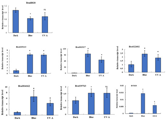 Relative expression of BrmiR828 and its candidate targets in seedlings of Brassica rapa with dark, blue, or UV-A light treatment was detected by qRT-PCR and calculated with 2−ΔΔCT. The ubiquitin (UBQ) gene served as the internal control to correct for template quantity. Each bar indicates the mean ± SE of three biological replicates assays after correcting for template quantity relative to the UBQ gene. Statistically significant differences between blue light treatment and dark, UV-A treatment and dark are shown (t-test, * p < 0.05; ns, not significant difference, df = 3)