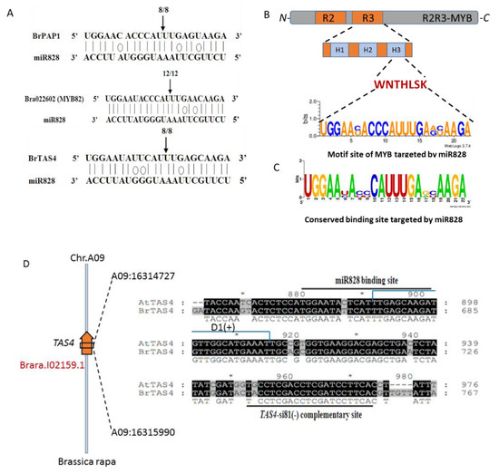 To confirm the regulation between BrmiR828 and their candidate targets, RLM-5′ RACE was used to detect the binding site and cleavage site. Sequencing of the 5′RACE PCR clones revealed that the miR828-guided cleavage of target BrPAP1 mRNA (Bra039763), BrMYB82 mRNA (Bra022602), and BrTAS4 mRNA occur as expected. Also, the cleavage sites were identified between 10 and 11 bases from the 5′ ends of the binding region in the BrmiR828 sequence (Figure 6A) and the motif site of MYB was targeted by miR828 coding for helix 3 of specific R3 domain (Figure 6B). Then, a conserved binding site targeted by BrmiR828 verified through RLM 5′-RACE can be concluded (Figure 6C). Unfortunately, we have not detected the cleavage sites of other candidate targets such as Bra001917, Bra004162, and Bra029113. Further analysis showed BrTAS4 is located on chromosome 9 of Brassica rapa (Figure 6D). After cleavage by BrmiR828, small RNAs (TAS4 siRNAs) were identified (Table 2) by high throughput sequencing [49] and one of the TAS4 siRNAs or siRNA TAS D4(−) was also predicted to target Bra039763 (BrPAP1), Bra004162 (BrPAP2), and Bra001917 (BrPAP2) (Figure S3).