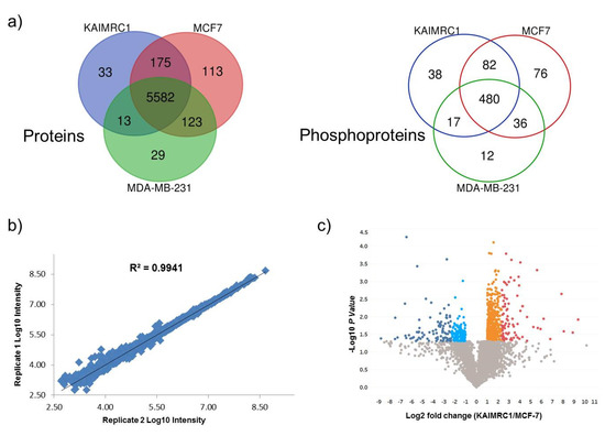 Comparative results revealed that 92% of the identified proteins are common among the three cell lines while only ~65% of the phosphoproteins overlap (Figure 2a). The eminent number of common proteins/phosphoproteins reflects the similarity of the proteome of the three breast cancer cell lines. However, our prime interest was to investigate the differentially expressed proteins (DEPs) in newly isolated cell line KAIMRC1. This comparative study of KAIMRC1 was performed to shed more light on dysregulated pathways involved in the transformation and the spontaneous immortalization of these cells. Thus, we applied pairwise comparisons for KAIMRC1 versus MCF-7 and MDA-MB-231. First, we evaluated the reproducibility of the proteomic quantitative analysis based on normalized reporter intensities using duplicate biological samples of KAIMRC1, MCF-7, and MDA-MB-231 cultured separately on different days. Results showed excellent reproducibility with an average of r2 > 0.96 for proteins and r2 > 0.84 for phosphoproteins as illustrated in Figure 2b. Reproducibility evaluation of proteins and phosphoproteins for other cell lines can be found in supplementary Figures S2 and S3. A previously published study using TMT-10-plex experiments has shown a similar degree of reproducibility [18].