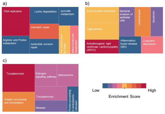 Treemap of Kyoto Encyclopedia of Genes and Genomes (KEGG) pathway classes for differentially expressed proteins (DEPs): Top Enrichment pathway classes for (a) upregulated proteins in KAIMRC1 versus MCF-7, (b) downregulated proteins in KAIMRC1 versus MCF-7, and (c) upregulated phosphoproteins in KAIMRC1 versus MCF-7 and MDA-MB-231. The color and size of each box indicate enrichment score and protein counts for each group. The enrichment analysis was set with statistical criteria (p < 0.05).