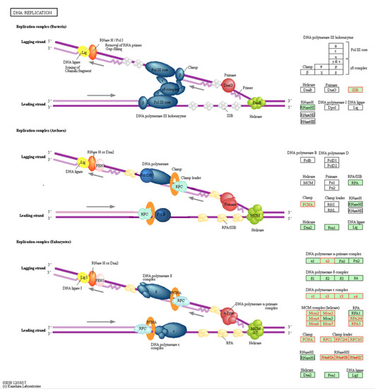 Illustration of DNA replication pathway in KEGG: Genes with red color are associated with upregulated proteins in KAIMRC1 compared to MCF-7 and MDA-MB-231 cell lines. Genes with green or white were not detected.