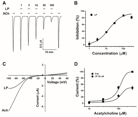 3.2. ACh Concentration–Response Profiles and Current–Voltage Relationship