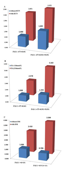 The associations between these polymorphisms and patient clinicopathological factors are shown in Table 3 and Supplemental Table S2. PAI-I -675 4G5G + 5G5G genotype showed an increased risk of CRC for patients aged < 61 years (AOR = 1.942; 95% CI: 1.247–3.024; p = 0.01), without HTN (AOR = 1.694; 95% CI: 1.093–2.627; p = 0.02), without DM (AOR = 1.464; 95% CI: 1.051–2.039; p = 0.02), with folate ≥ 3.8 ng/mL (AOR = 1.449; 95% CI: 1.030–2.039; p = 0.03), and with homocysteine ≤ 13.2 µmol/L (AOR = 1.630; 95% CI: 1.163–2.285; p = 0.01). However, the PAI-1 +11053TG + GG genotype was related to a protective effect against CRC for patients aged < 61 years (AOR = 0.563; 95% CI: 0.333–0.950; p = 0.03), with HTN (AOR = 0.618; 95% CI: 0.382–1.001; p = 0.05), without DM (AOR = 0.633; 95% CI: 0.425–0.942; p = 0.02), with folate ≥ 3.8 ng/mL (AOR = 0.669; 95% CI: 0.448–0.999; p = 0.05), and with BMI ≥ 25 (AOR = 0.420; 95% CI: 0.192–0.920; p = 0.03). However, after considering multiple comparisons, we concluded that the association of 4G5G + 5G5G, the association of 11053TG + GG, and the association of 9785GA polymorphism had no relation with CRC. The PAI-1 -675 4G5G + 5G5G genotype with HTN was three times more likely to develop CRC than the 4G4G genotype without HTN and was five times more likely to develop CRC in patients with a folate level ≤ 3.8 nmol/L (Figure 1 and Supplementary Table S5). Moreover, the PAI-1 43GA + AA genotype with DM were three times more likely to increase the CRC incidence than the GG genotype without DM (Figure 1 and Supplementary Table S5).
