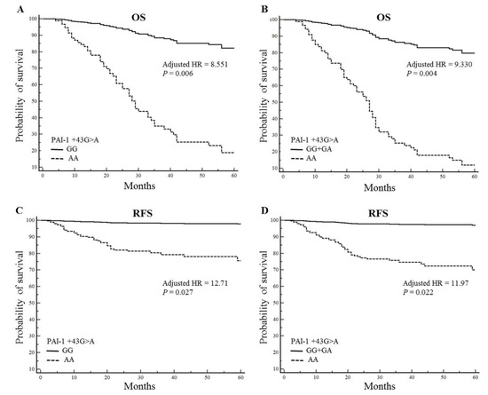 The associations between PAI-1 polymorphisms and CRC patient survival are shown in Figure 2. Multivariate Cox proportional analysis (Supplemental Tables S3 and S4) showed that only the PAI-1 +43 genotype had a significant effect on survival. Compared with the +43GG genotype, the +43AA genotype was associated with poor OS (overall survival) (HR = 8.551; 95% CI: 1.833–39.89; p = 0.01; Figure 2A) and relapse-free survival (RFS) (HR = 12.71; 95% CI: 1.330–121.3; p = 0.03; Figure 2C). Moreover, OS (HR = 9.330; 95% CI: 2.043–42.61; p = 0.01; Figure 2B) and RFS (HR = 11.97; 95% CI: 1.433–100.0; p = 0.02; Figure 2D) were associated with the recessive genotype (GG + GA vs. AA). However, no associations between other polymorphisms and survival outcomes were found.
