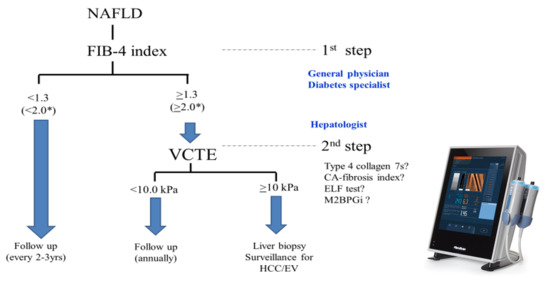 For diagnosing NAFLD, a two-step algorithm is now globally accepted [84,89,110,111], as shown in Figure 1. As the first step, patients with NAFLD who have a FIB-4 index <1.3 who are unlikely to have advanced stage (F3/4) can be followed up. The FIB-4 index should be measured every 2 or 3 years. As the second step, patients with NAFLD who have a FIB-4 index ≥1.3 are recommended to receive VCTE. Patients with VCTE ≥10 kPa have to undergo liver biopsy unless they have any contra-indications for performing liver biopsy, and subjects with VCTE ≤10 kPa can be followed up with annual VCTE. One concern is that not all institutions have VCTE even in Japan. However, there are alternative NITs for evaluating hepatic fibrosis, including the type IV collagen 7s, CA-fibrosis index and ELF test. MR elastography is positioned as third step, considering its cost, duration, and contraindication in patients with pacemakers or claustrophobia. Better algorithms are expected to be developed from the point of view of accuracy, non-invasiveness, and cost–benefit balance owing to the huge number of people with NAFLD. Because the FIB-4 index is influenced by age, some reports have suggested a low cutoff value of 2.0 in older patients (aged 65 to 70 y or older) [90,91]. Old NAFLD patients showing FIB-4 index <2.0 are unlikely to have advanced fibrosis.