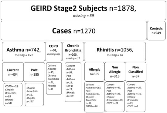 In this work, data collected between years 2007 and 2013 in four Italian centers (Verona, Pavia, Turin and Sassari) has been analyzed. Out of 16,569 subjects selected in the first stage of GEIRD, 9741 (59%) completed the screening questionnaire. Of them, 4981 (51%) were furtherly selected to attend stage 2 and 2259 (45%) participated in the clinical survey. Data were available for 1878 subjects of the final group. Figure 1 shows the flowchart reflecting the overall situation of the GEIRD stage 2 study. It covers all respiratory pathologies including those not addressed in our analysis.