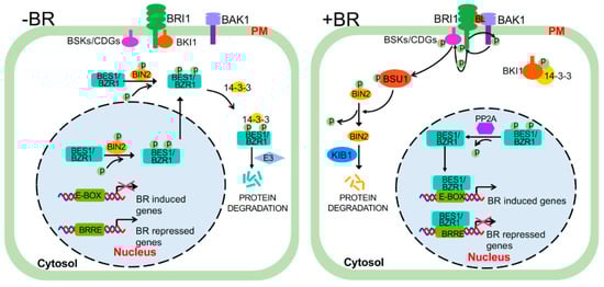 A current model of BR signaling. When BRs (brassinosteroids) are absent (left), BRI1 (Brassinosteroid-Insensitive1) is kept inactive by its autoinhibitory C-terminus and BKI1 (BRI1 Kinase Inhibitor1) association. BIN2 (Brassinosteroid-Insensitive2) is constitutively active and phosphorylates BES1 (bri1-EMS suppressor1)/BZR1 (Brassinazole-resistant1) transcription factors to promote their degradation and 14-3-3-mediated cytosolic retention, and to directly inhibit their DNA-binding activities. When BRs are present (right) and bind to the extracellular domains of BRI1 and its co-receptor BAK1 (BRI1 Associated receptor Kinase1) to activate the two receptor kinases, leading to dissociation of BKI1 from BRI1, phosphorylation and activation of BSKs (BR-signaling kinases)/CDGs (Constitutive Differential Growth) and BSU1 (bri1 suppressor1). The activated BSU1 dephosphorylates and inactivates BIN2 while KIB1 (Kink suppressed in bzr1-1D1) promotes BIN2 degradation, causing nuclear accumulation of PP2A (protein phosphatase 2A)-dephosphorylated BES1/BZR1 that bind BRRE (BR response element)/E-box-containing promoters to regulate expression of thousands of BR-responsive genes important for plant growth and development.