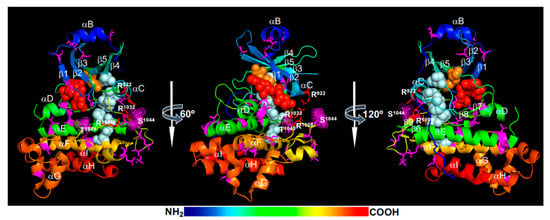 A structural model of the activated BRI1 kinase domain. Shown here are three (0°, 60°, and 180°) rotational views of a rainbow-colored ribbon model of the crystal structure of the BRI1 kinase domain (Protein Data Bank No. 4oh4). Individual α-helices (αB-αI) and β-strands (β1-β5) were labelled. The magenta-colored sticks indicate phosphorylated Ser/Thr residues with the magenta dots surrounding Ser1044 and Thr1049 of the activation segment, the green sticks denote the Lys911 and Glu927 residues that form the salt bridge between the β3-strand and αC-helix, the red sticks mark the three positively charged residues of the phosphate-binding pocket, and the orange sticks represent the phosphorylated Tyr residue. The red spheres show adenylyl-imidodiphosphate (a non-hydrolysable ATP analog), the orange spheres indicate the gatekeeper Tyr956 residue that is also phosphorylated in in vitro assays, and the light-blue spheres denote the five regulatory-spine (R-spine) residues (from lower to upper: Asp1068, His1077, Phe1028, Ile931, and Leu942). The rainbow bar indicates the order of amino acids (AAs) from the N-terminus (blue) to the C-terminus (red).